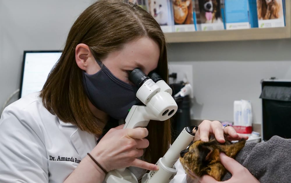 It was a college lecture that first drew Dr. Amanda Romaneck into the field of veterinary ophthalmology, and she’s been learning, teaching—and now practicing—ever since. As a specialty ophthalmology intern (and soon-to-be resident) with Animal Vision Center of Virginia, she assists Dr. Heather Brookshire with patient exams and surgeries, participates in the practice’s online “rounds” series with general veterinarians, and will undertake a research project involving nutrition’s role in improving ocular health.