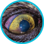 Corneal sequestrums are regions of dead/necrotic cornea. This lesion is caused by either chronic irritation to the corneal surface; physiologic exophthalmos (“buggy”/prominent eyes) in Persian, Himalayan and Burmese cats; or chronic ulceration associated with FHV-1. The lesion is easily recognized by the brown discoloration of the cornea. There is a wide spectrum of appearances, anywhere from a faint, superficial amber hue, to a deep, dark black plaque within the corneal stroma.